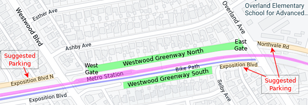 If you come by car, free parking is available on Exposition Blvd North, west of Westwood, and Northvale Road, east of Overland. See map below.