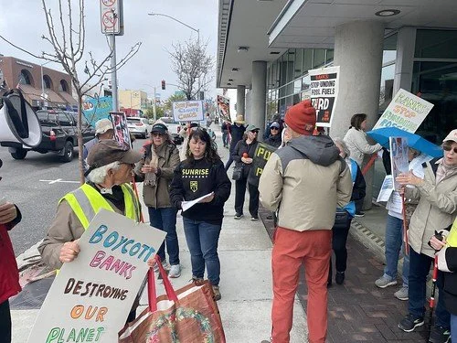 On March 21, climate activists from Third Act braved the rain in several locations around Los Angeles as part of the Stop Dirty Banks national day of action to draw attention to how Bank of America, Chase, Citibank, and Wells Fargo continue to pour billions of dollars into fossil fuel investments.